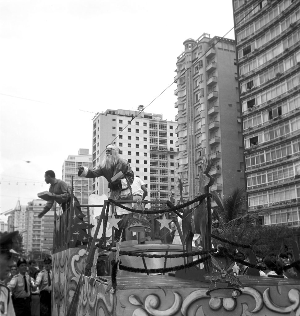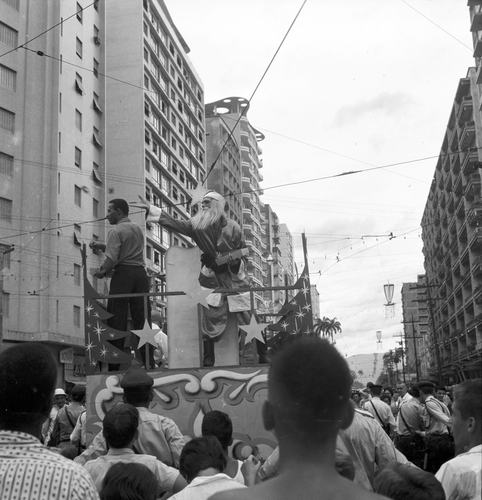 Em seguida, começou o grande desfile pela avenida Vicente de Carvalho, do Gonzaga ao Boqueirão. Integraram-se ao cortejo a banda do Abrigo e Triagem de Menores, o Clube da Criança, o conjunto musical da Refinaria Presidente Bernardes, além da banda do Educandário Anália Franco, regida pelo maestro Burgos. Entre aplausos, câmeras fotográficas e mãos acenando sem parar, surgiu no final a monumental carruagem com o sorridente Papai Noel, que distribuiu milhares de pirulitos Kibon ao delírio da garotada.