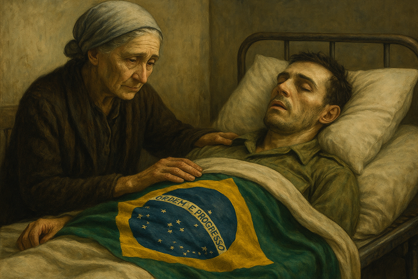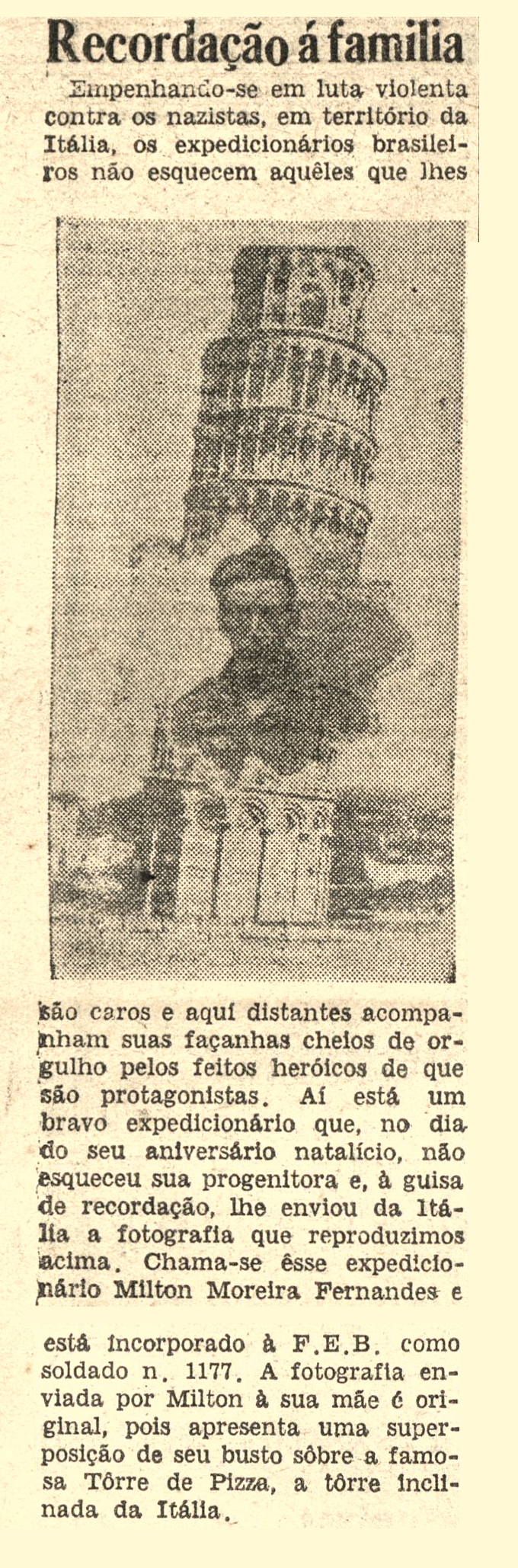 No interior do casebre, a mãe, Dona Joana, velava o filho de olhos fundos e respiração curta. Aquele mesmo rapaz que partira três anos antes, sorridente, farda nova, e a promessa de defender o Brasil gravada no coração. A guerra o devolvera mudado: o corpo magro, o olhar distante, o peito cavado por uma tosse seca que não cedia. Da Europa, trouxera apenas uma fotografia — seu rosto sobreposto à Torre de Pisa, símbolo do orgulho juvenil — e uma bandeira nacional dobrada, guardada como relíquia entre as poucas roupas.