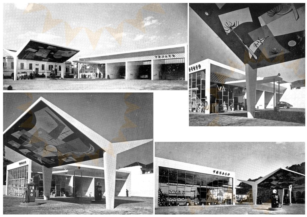 Em 1957, no auge do otimismo modernista que marcava o Brasil de Juscelino Kubitschek, Santos incorporava ao seu cenário urbano um exemplo notável da integração entre arte e arquitetura: um posto Texaco, localizado na zona intermediária da cidade, com frente para a avenida Conselheiro Nébias. Projetado pelo arquiteto Oswaldo Corrêa Gonçalves, com colaboração de Osmar Antonio Tosi, o imóvel destacava-se pelas linhas arrojadas, amplos vãos envidraçados e pela marquise de forma plástica vigorosa — um símbolo da estética funcional e elegante que definia o modernismo paulista. No teto da cobertura, um grande painel criado pelo pintor Irenio Guerreiro Maia, que fora assistente de Di Cavalcanti (que, certamente, lhe influenciou bastante), conferia identidade artística à construção, tornando-se uma das primeiras obras do gênero no Brasil. O painel, em óleo sobre estrutura arquitetônica, refletia as tendências do abstracionismo geométrico e do muralismo integrativo, aproximando Santos do movimento que transformava o país em um laboratório de arte e urbanismo modernos. A inauguração do posto Texaco consolidou-se, assim, como um ponto importante da paisagem santista e da fase em que a cidade abraçava o diálogo entre arte, progresso e arquitetura, alinhando-se ao espírito de modernidade que caracterizava o Brasil dos anos 1950.